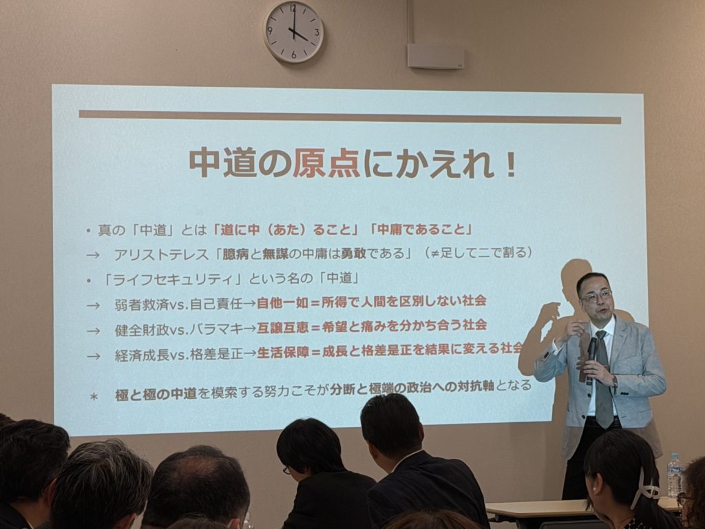 本議員連盟には、現在109名の地方議員が参加しております。党派を超えて、「弱者を助ける」のではなく、「弱者を生まない社会をつくる」という理念に、多くの皆様にご賛同いただいております。本日の総会や井手英策先生の記念講演では、ベーシックサービスは理念だけではなく、「財源」や「財政のあり方」と真正面から向き合う必要があるという点です。各自治体においても、厳しい財政状況の中で判断が求められているのが現実です。
